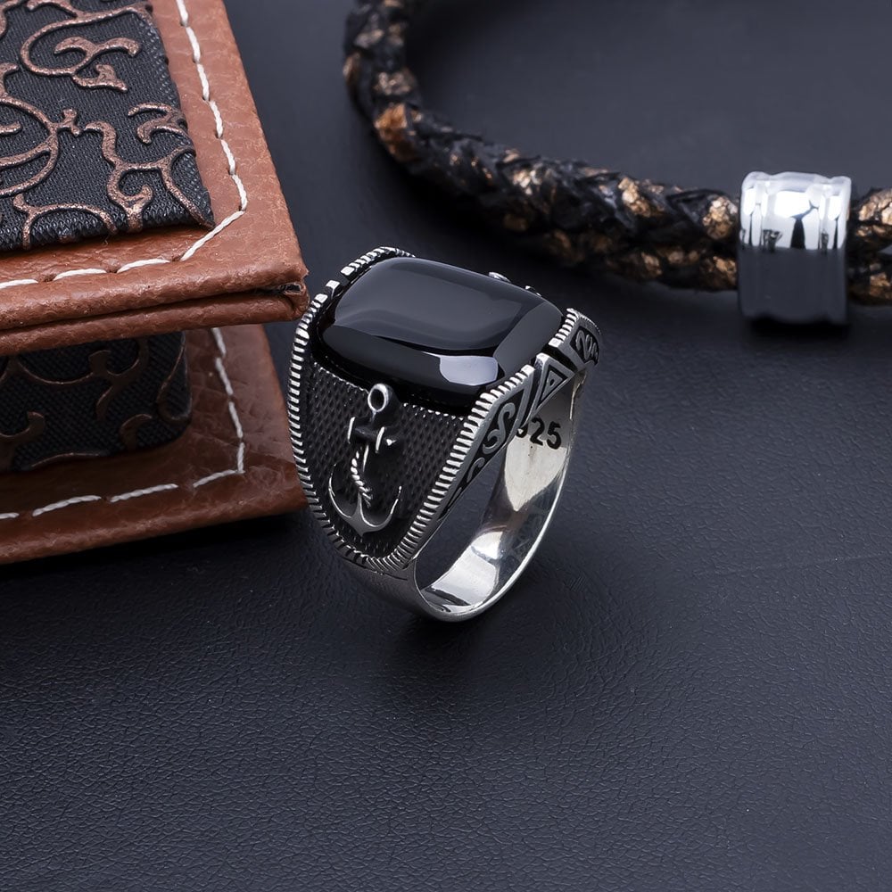 925 Ayar Gümüş Oniks Taşlı Çapa Detaylı Erkek Yüzük